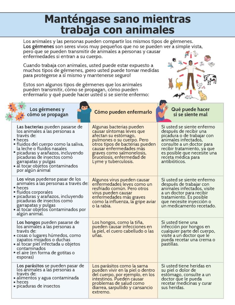 Did you know that animals and people can get sick from many of the same types of germs? This flyer describes key zoonotic pathogens, how they spread, the diseases they can cause, and steps workers can take to protect their health. Available in English and Spanish.