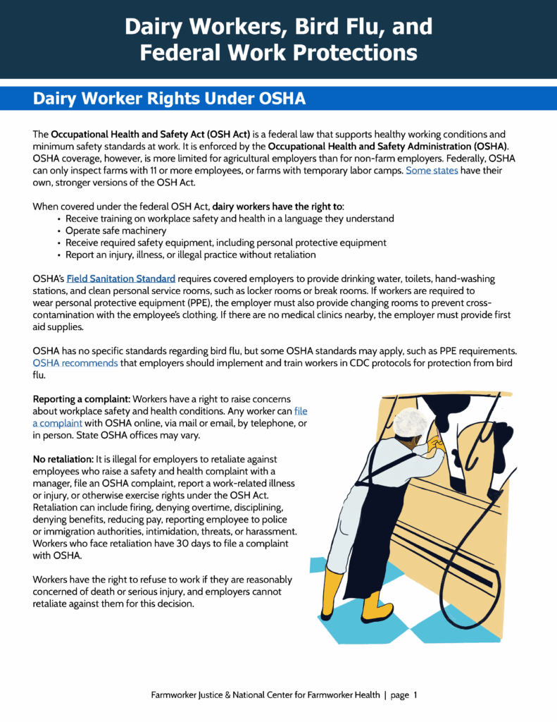 This fact sheet provides an overview of federal regulations and recommendations to protect dairy workers from H5N1 (bird flu). It was created by Farmworker Justice in collaboration with the National Center for Farmworker Health. Available in English and Spanish.