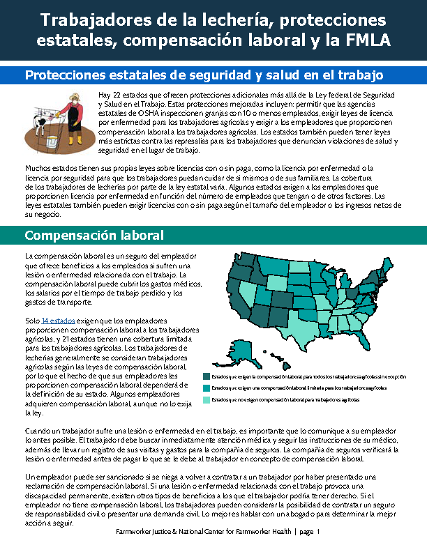This fact sheet provides an overview of state-level protections to support the health and safety of dairy workers. It was created by Farmworker Justice in collaboration with the National Center for Farmworker Health. Available in English and Spanish.